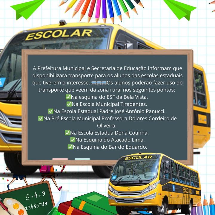 A Prefeitura Municipal e Secretaria de Educação informam que disponibilizará transporte para os alunos das escolas estaduais que tiverem o interesse. ???Os alunos poderão fazer uso do transporte que veem da zona rural nos seguintes pontos: