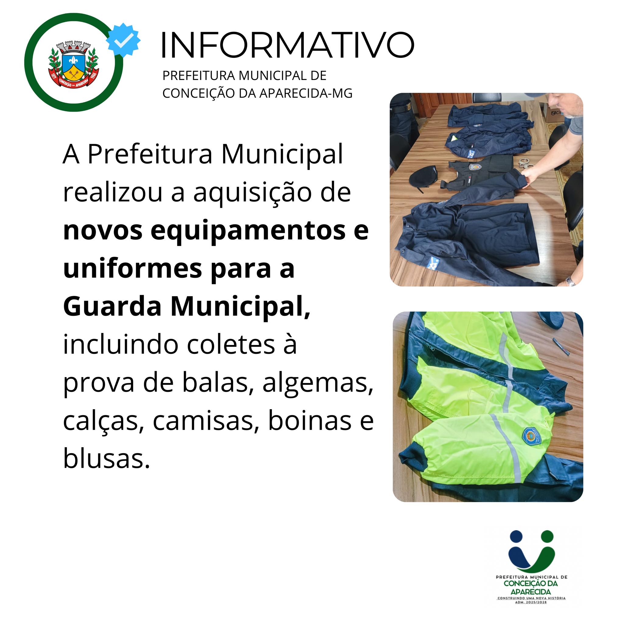 A Prefeitura Municipal realizou a aquisição de novos equipamentos e uniformes para a Guarda Municipal, incluindo coletes à prova de balas, algemas, calças, camisas, boinas e blusas.
