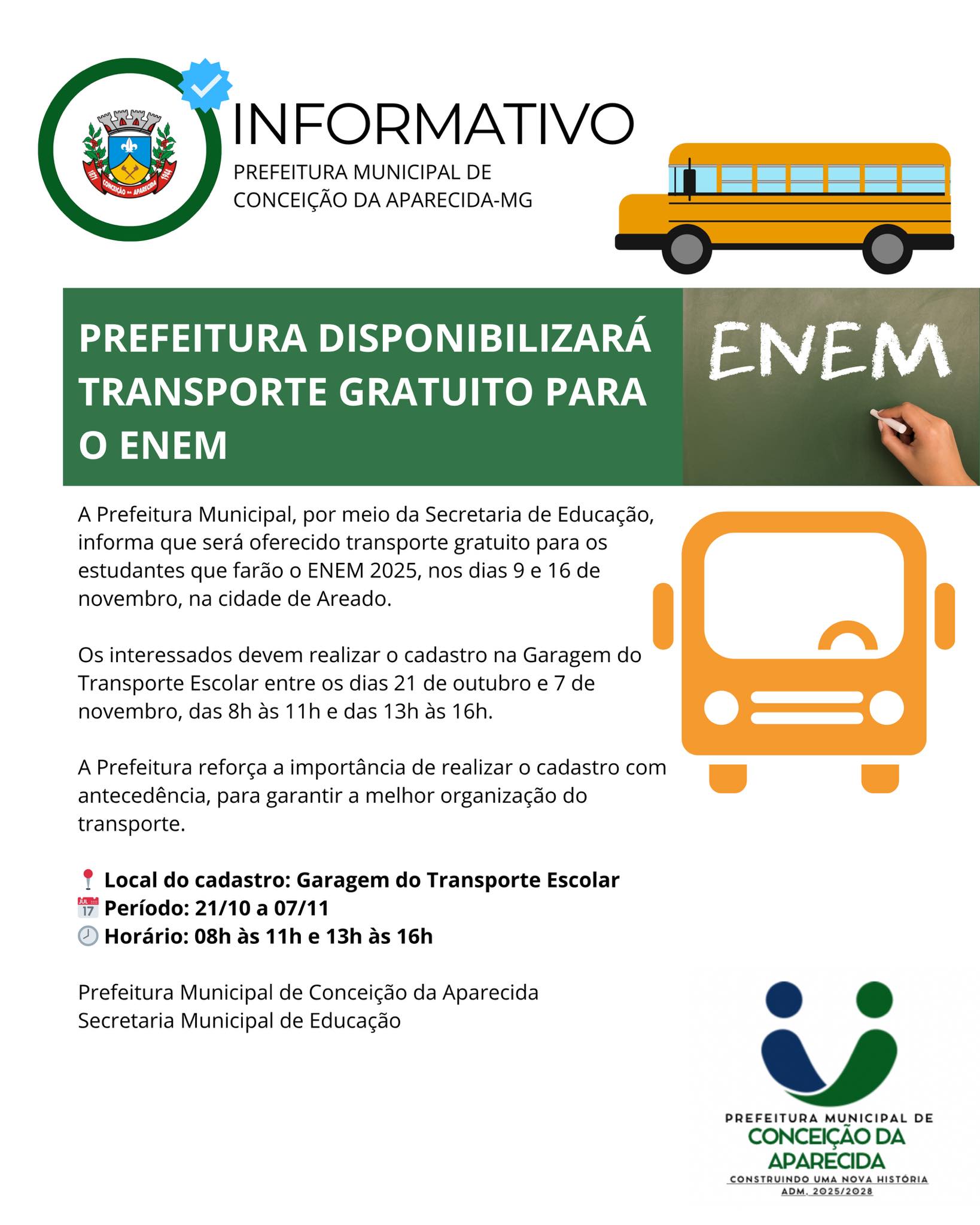 A Prefeitura Municipal, por meio da Secretaria de Educação, informa que será oferecido transporte gratuito para os estudantes que farão o ENEM 2025, nos dias 9 e 16 de novembro, na cidade de Areado.