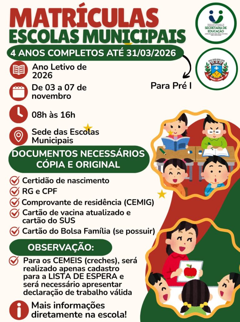 A Secretaria Municipal de Educação informa que o período de matrículas para as escolas da Rede Municipal de Educação acontecerá de 03 a 07 de novembro de 2025, no horário de 8h às 16h, em cada unidade escolar.