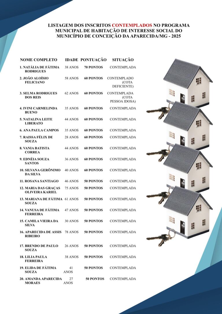 👉O programa priorizou critérios sociais estabelecidos em lei, assegurando transparência e justiça no processo de seleção. Com essa ação, Conceição da Aparecida avança mais uma vez na construção de uma cidade mais justa, humana e acolhedora para todos.
