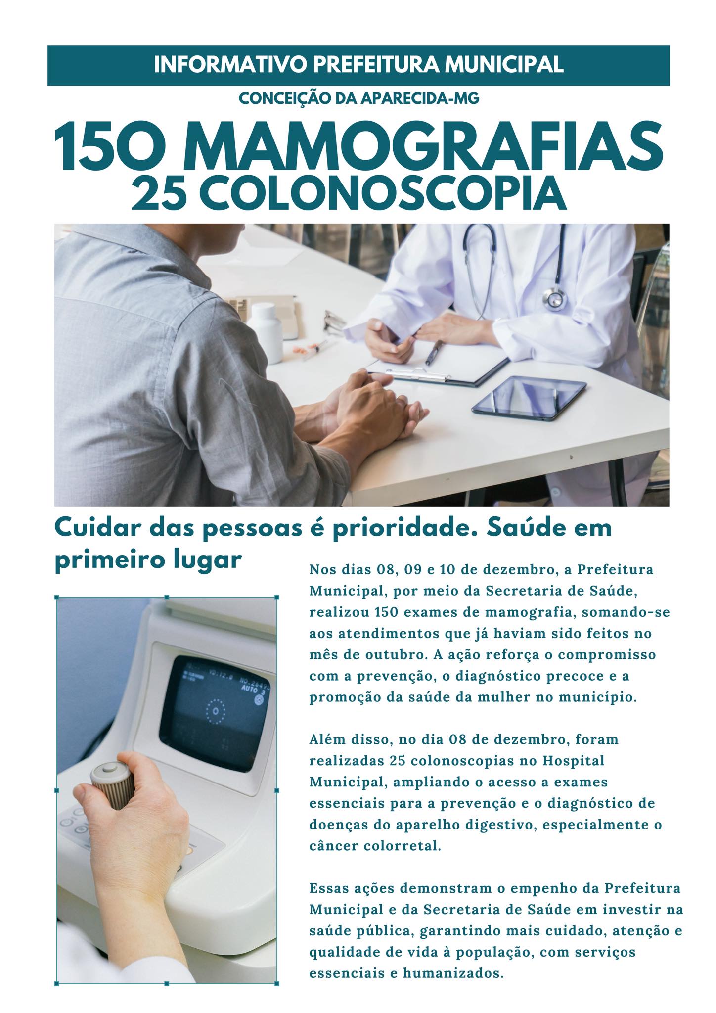 Além disso, no dia 08 de dezembro, foram realizadas 25 colonoscopias no Hospital Municipal, ampliando o acesso a exames essenciais para a prevenção e o diagnóstico de doenças do aparelho digestivo, especialmente o câncer colorretal.