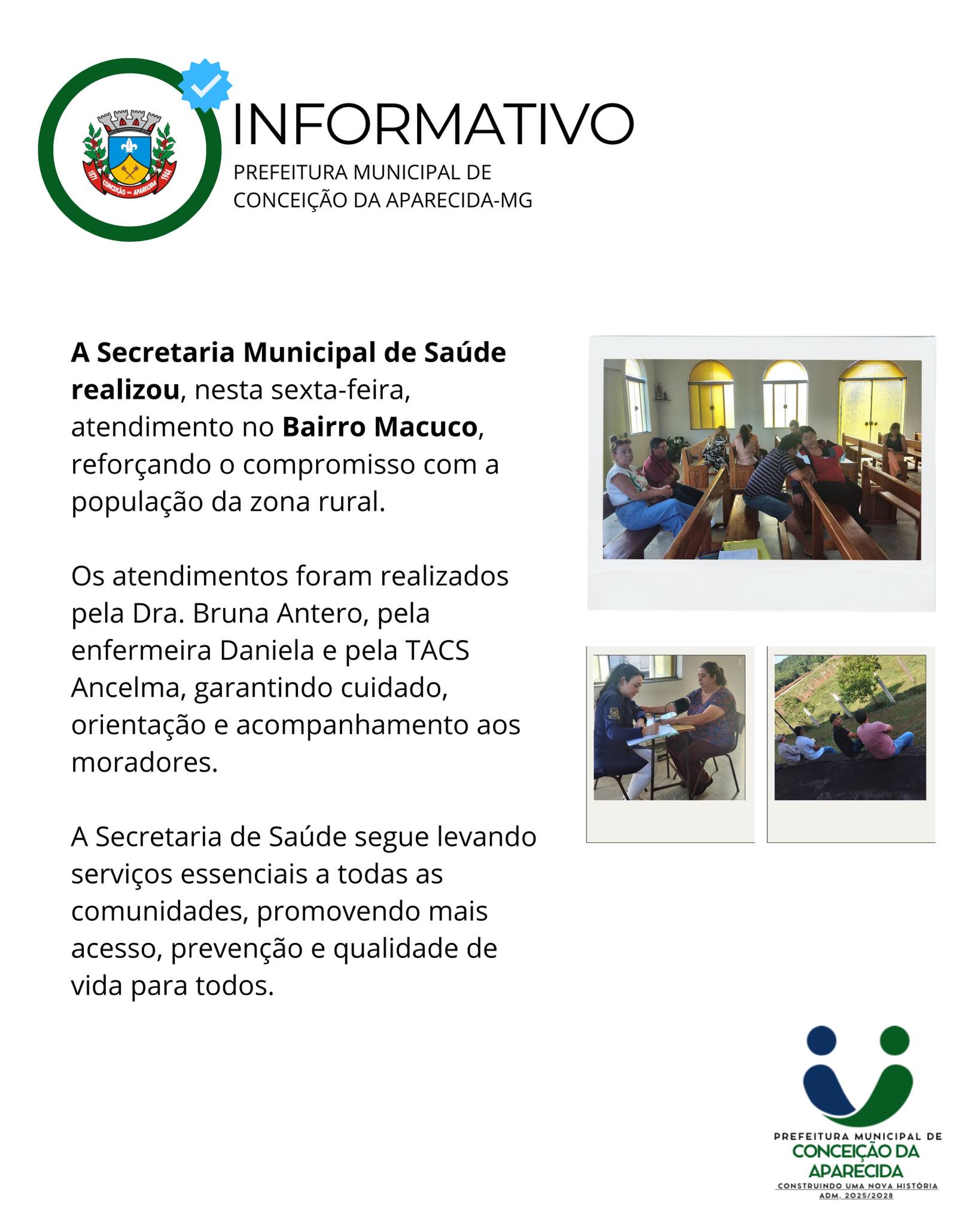 A Secretaria Municipal de Saúde realizou, nesta sexta-feira, atendimento no Bairro Macuco, reforçando o compromisso com a população da zona rural.