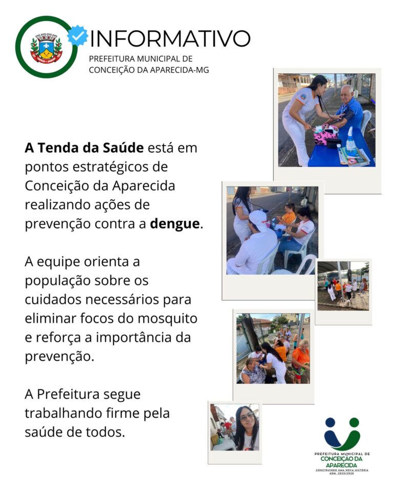 Hoje, a Tenda da Saúde está em pontos estratégicos de Conceição da Aparecida realizando ações de prevenção contra a dengue.