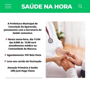 ✅ SAÚDE NA HORA A Prefeitura Municipal de Conceição da Aparecida, juntamente com a Secretaria de Saúde comunica: 📌 Nesta sába… Leia Mais »