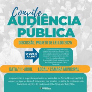 ✅ Transparência na Administração Municipal 👉🏻 Será realizada no dia 11 de abril de 2024 a partir das 16:30hs na Câmara Municipal… Leia Mais »