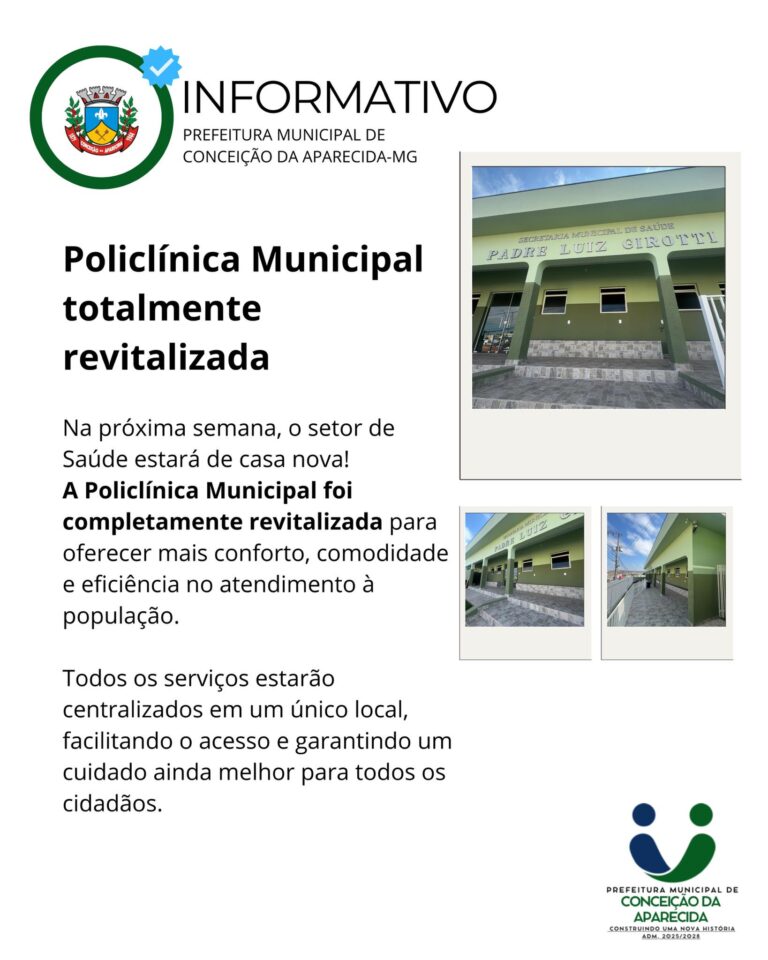 Na próxima semana, o setor de Saúde estará de casa nova!A Policlínica Municipal foi completamente revitalizada para oferecer mais conforto, comodidade e eficiência no atendimento à população. Todos os serviços